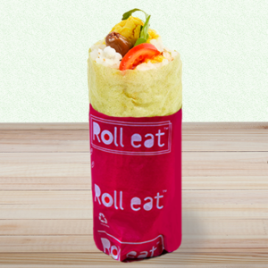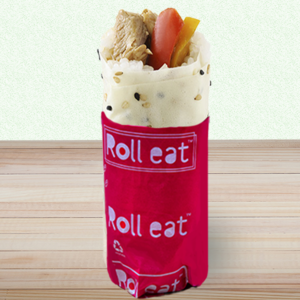 Sfoglia di soia con semi di sesamo, riso, pollo, peperoni, cipolla rossa, crema alle melanzane, salsa bbq giapponese. (Informazioni: il prodotto è caldo).
